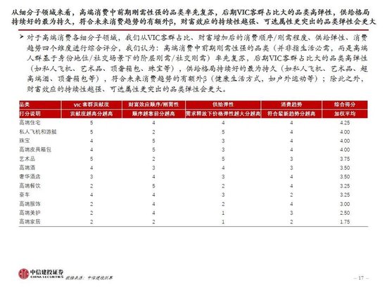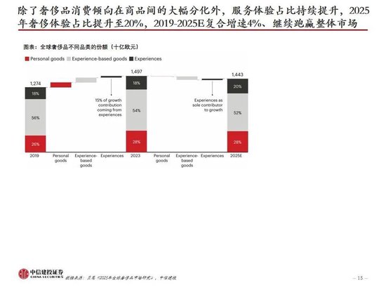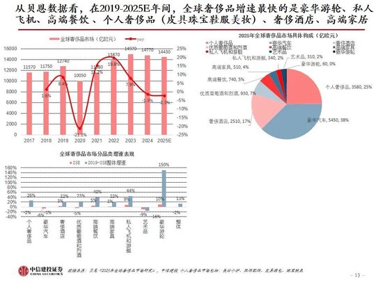 如何看待高端消费各品类复苏节奏和投资机会:复盘全球奢侈品过去5年的情况,根据贝恩的数据,2019-2025E年间全球奢侈品市场增速最快的是豪华游轮、私人飞机、高端餐饮 、个人奢侈品(皮具珠宝鞋服美妆)、奢侈酒店、高端家居;个人奢侈品中,预计2025年珠宝表现最优(增长4%-6%),鞋服等更可选品类明显收缩约5%-7%。除了奢侈品消费倾向在商品间的大幅分化外,服务体验占比也在持续提升,2025年奢侈体验占比提升至20%,2019-2025E复合增速4%、继续跑赢整体市场。我们认为高端消费不同品类的复苏时点和强度主要由VIC客群占比、财富增加后的消费顺序/刚需程度、供给弹性、消费趋势四个维度决定,其中前三个是短期因素、第四个是长期因素但是近年变化很快。从细分子领域来看,前期刚需性强的品类(并非指生活必需,而是高端人群基于身份地位/社交场景下的阶层刚需/社交刚需等)率先复苏,后期VIC客群占比大的品类高弹性,供给格局持续好的最为持久,符合未来消费趋势的有额外β,财富效应的持续性越强、可选属性更突出的品类弹性会更大。