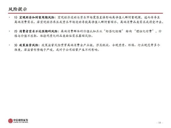 1)宏观经济和财富周期风险:宏观经济波动与资本市场震荡直接影响高净值人群财富规模,进而传导至高端消费需求。若宏观经济承压或资本市场波动导致高净值人群财富缩水,高端消费品类需求或将受冲击。