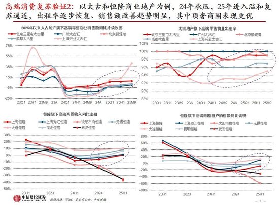 高端消费正在复苏进行中的三个验证点。1)国际奢侈品品牌在24年走弱态势后25Q2起逐步恢复,25Q3各集团(除开云)亚太地区收入增速均已回正增,中国本土市场亦在改善;2)我国高端零售物业也于2024年底、2025年初开始复苏,以太古和恒隆地产为例,2024年承压后、2025年起进入温和复苏通道,出租率逐步恢复、销售额改善趋势明显,其中顶奢商场表现更优。3)全球奢侈市场在25Q3开始亦进入到复苏阶段。
