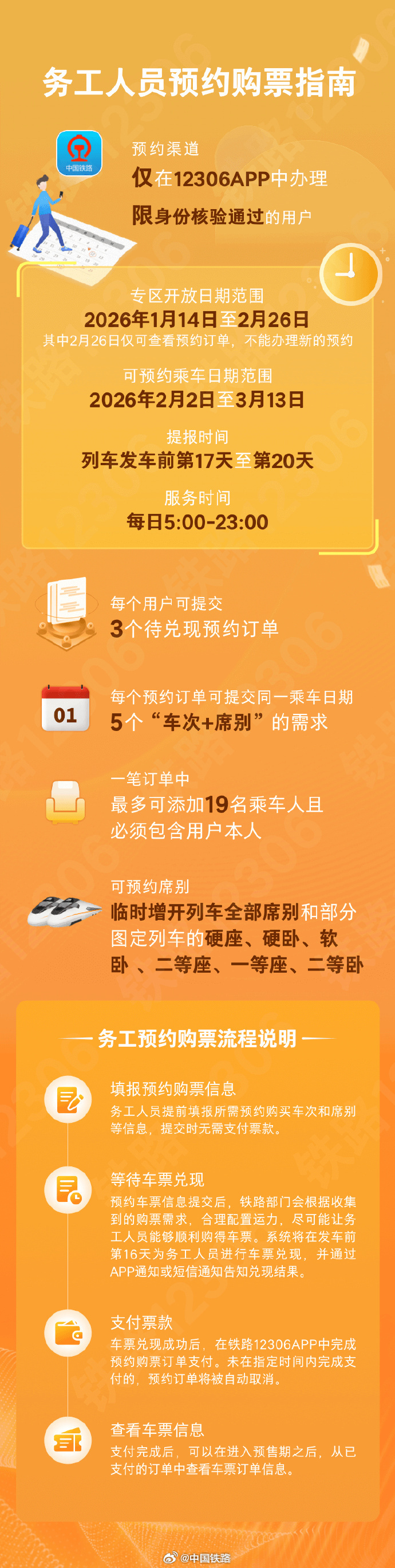 铁路部门提示,铁路12306网站(含手机客户端)是中国铁路唯一官方火车票网络售票平台,致力于为广大旅客提供公平公正、安全便捷的购票出行服务,从未与任何第三方平台机构开展合作,没有任何购票加速包、购票会员费、挑选车厢座位费等额外收费,发生改签、退票时严格按规定办理,同时严格依法保护旅客个人信息安全。请广大旅客朋友一定要通过铁路官方渠道购票,认准12306官方网站和“铁路12306”官方App。